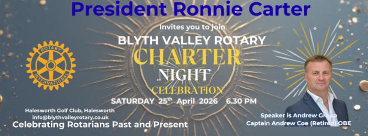 Purchase tickets for Blyth Valley Rotary's 66th Charter Night Dinner. Full details, including the menu, can be found at