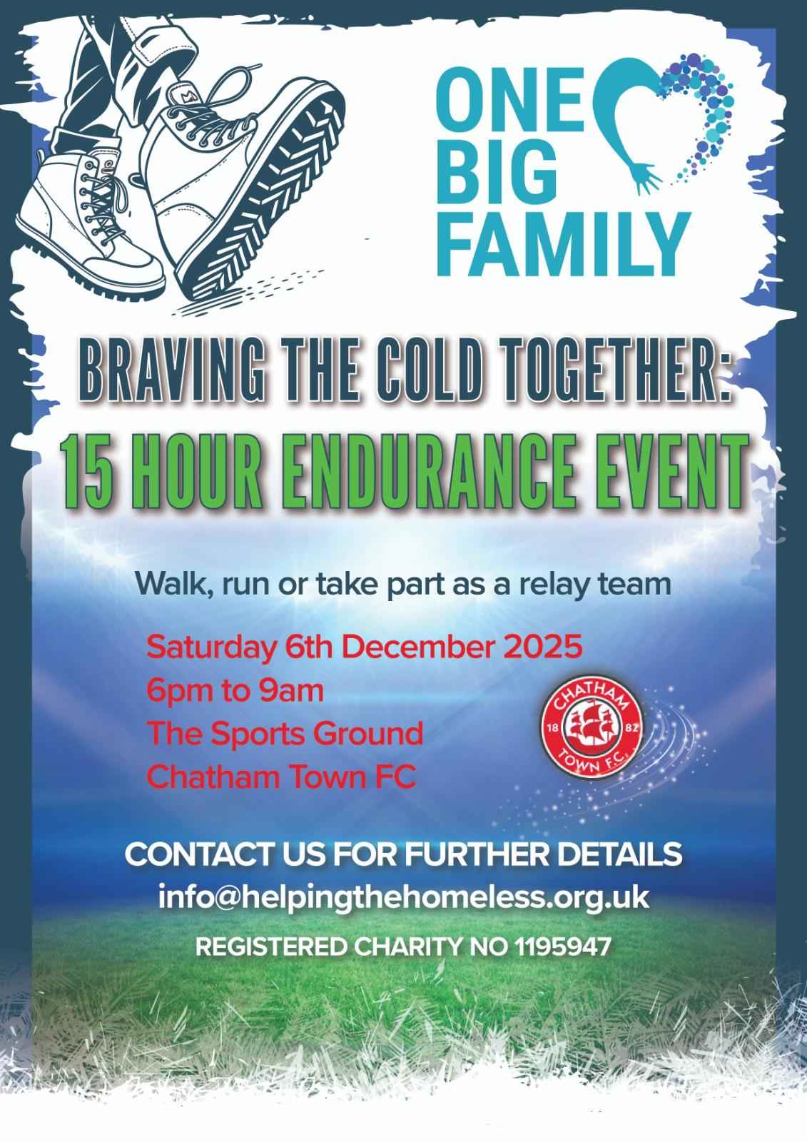 A 15 hour endurance event at Chatham Town FC. This is both an individual event and a team event, with participants running or walking for 15 hours at the track.